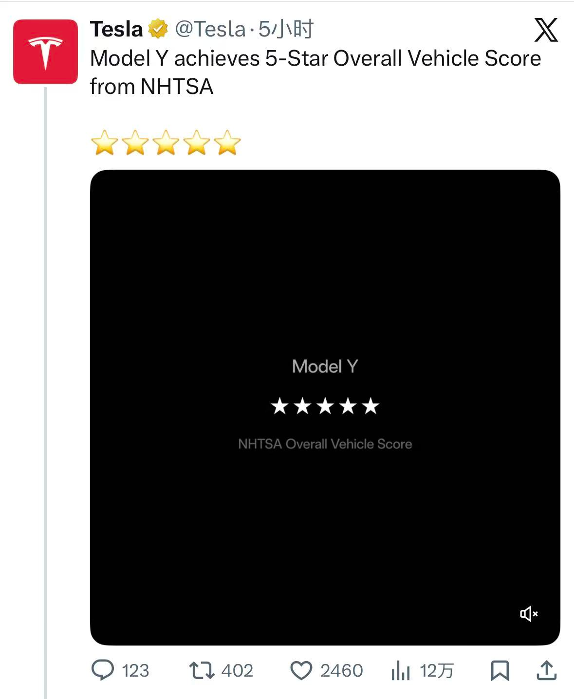 2月10日,特斯拉(TSLA.US)官方賬號在社交平台X上官宣,特斯拉Model Y 獲得美國國家公路交通安全管理局(NHTSA)5星整體車輛評分。