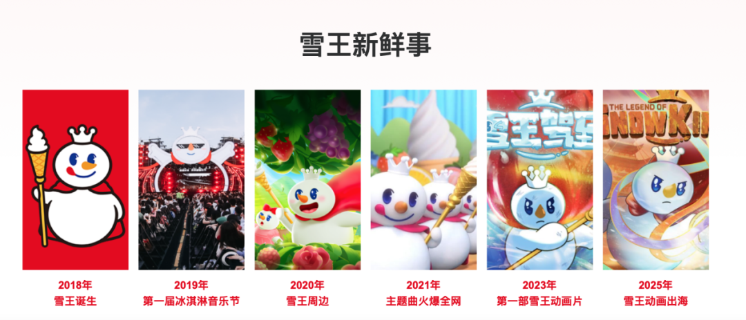 2023年8月,蜜雪冰城推出了以雪王為主角的首部動畫《雪王駕到》,此後又推出了《雪王之奇幻沙洲》等原創動漫作品。