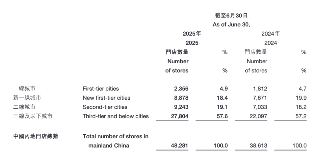 相比之下,一線城市門店僅2356家,佔比為4.9%;新一線城市的門店數為8878家,佔比為18.4%;二線城市門店達9243家,佔比為19.1%。