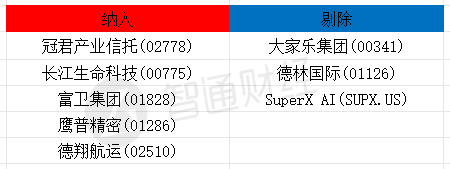 此外,MSCI全球小盤股指數於中國香港地區納入冠君產業信託(02778)、長江生命科技(00755)、富衛集團(01828)、鷹普精密(01286)、德翔航運(02510)。同時剔除大家樂集團(00341)、德林國際(01126)、SuperXAI(SUPX.US)。
