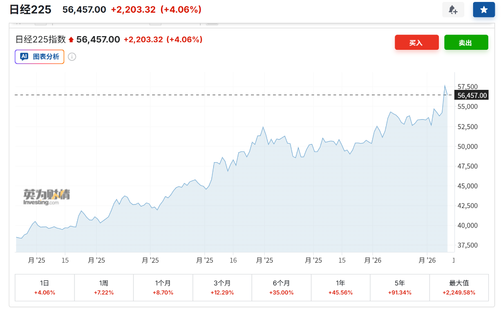 受執政聯盟在衆議院選舉中獲得過半數議席的提振,日本金融市場周一全面開啓「風險偏好」模式。日經225指數盤中一度飆升5.7%,突破57,000點大關,創下歷史新高。投資者押注新政府的財政支出計劃將直接利好國防和科技板塊,日元兌美元匯率也一度上漲0.6%至156.22,遠離了此前引發干預擔憂的160關口。