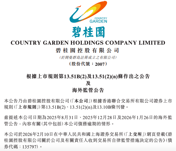 2月10日晚,碧桂園在港交所公告稱,該公司及公司執行董事及主席楊惠妍、執行董事及聯席主席莫斌及執行董事及財務負責人伍碧君於近期收到上交所出具的《紀律處分決定書》,由於該公司未能按照上交所的相關債券上市規則等規定及時披露公司於2023年8月至12月、2024年1月至6月、2024年7月至12月存在債務逾期情形,上交所分別對該公司、楊女士、莫先生、伍女士及其他具名人士(統稱「該等人士」) 作出自律監管措施決定,對公司及該等人士予以通報批評,並記入誠信檔案。
