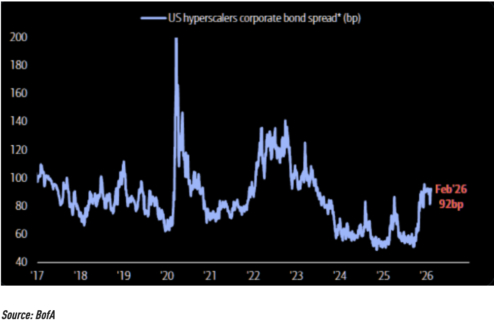 這股情緒也外溢至債市。債務投資者擔憂科技巨頭為爭奪更強AI能力而持續加槓桿,債券信用利差擴大,同時帶動單一公司信用違約互換(CDS)交易升溫。