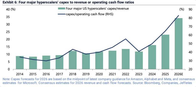 科技巨頭被迫大規模進入債市的根本原因在於內部現金流已不足以支撐其AI投資規模。據測算,若2026年資本支出達到7000億美元量級,這一數字將幾乎等於超大規模雲廠商的全部經營現金流。