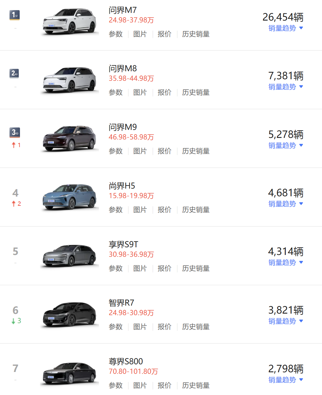 進入前三名的還包括鴻蒙智行,1月銷量為57915輛,按年增長65.5%。目前鴻蒙智行旗下已佈局AITO問界、LUXEED智界、STELATO享界、MAEXTRO尊界、SAIC尚界五大品牌,產品覆蓋20萬至150萬元價格帶。零售數據顯示,1月鴻蒙智行旗下產品銷量最高的車型為問界M7,銷量為26454輛;問界M8、問界M9銷量分別為7381輛和5278輛。此外,尚界H5、享界S9T銷量為4681輛和4314輛。
