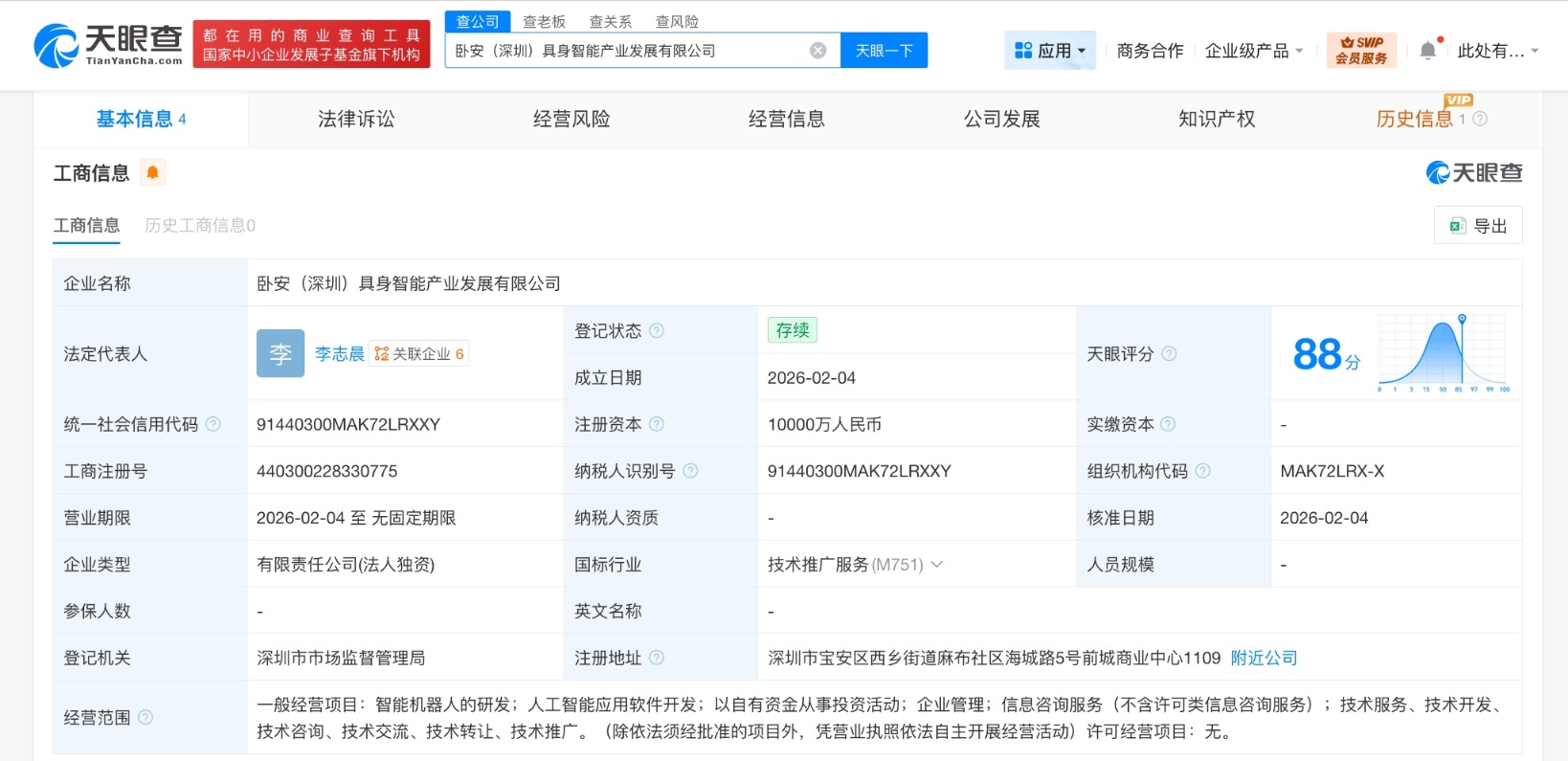 南方財經2月13日電,天眼查App顯示,近日,臥安(深圳)具身智能產業發展有限公司成立,法定代表人為李志晨,註冊資本1億人民幣,經營範圍為智能機器人的研發,人工智能應用軟件開發,以自有資金從事投資活動,企業管理,信息諮詢服務,技術服務、技術開發、技術諮詢、技術交流、技術轉讓、技術推廣。股東信息顯示,該公司由臥安機器人(深圳)股份有限公司全資持股。