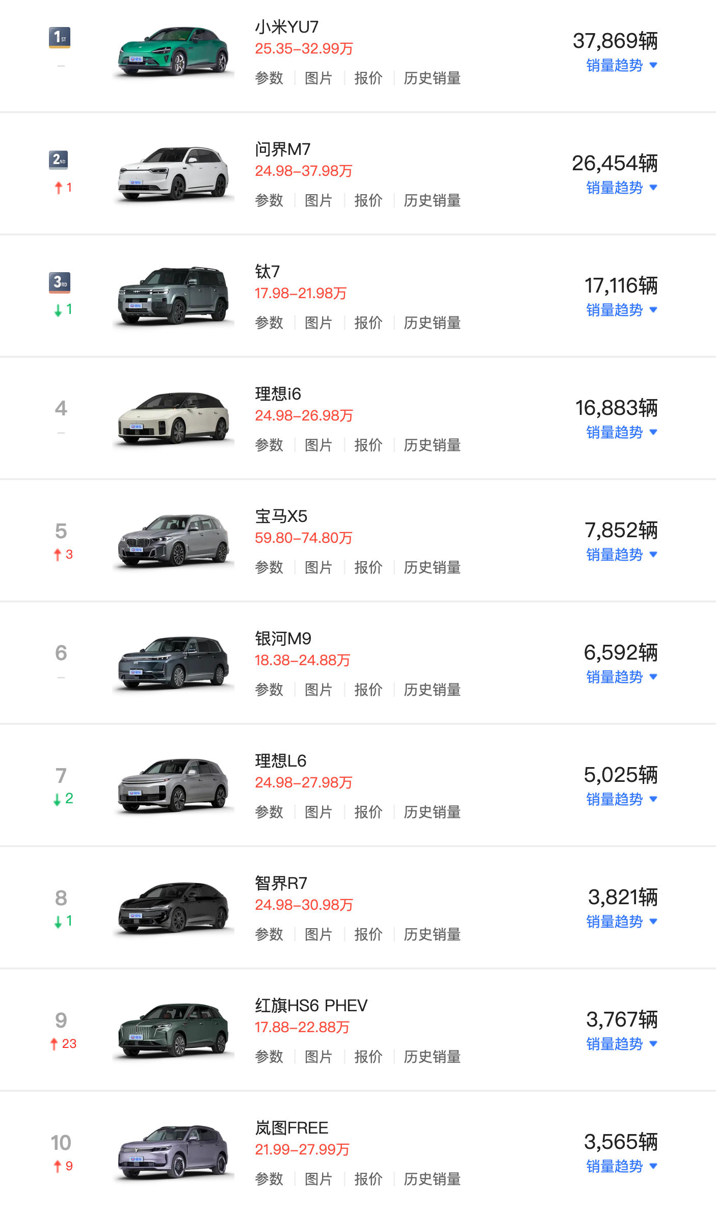 銀河M9的主要競品是小米YU7、問界M7,在上述兩款車型表現穩定的情況下,銀河M9多多少少受到了影響,1月車市整體低迷,M9按月下滑約38%至6592輛,但仍進入中大型SUV銷量前十,表現優於多數同級燃油與新能源車型。