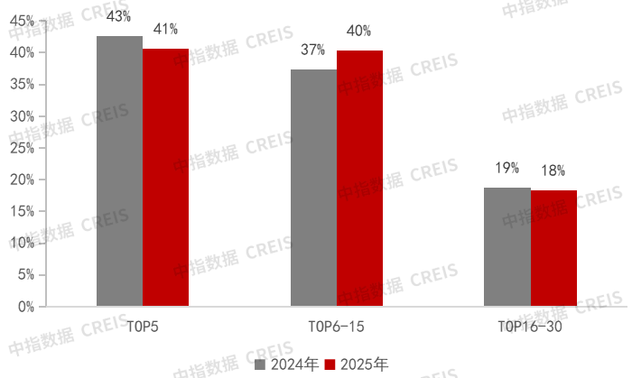 智通財經APP獲悉,中指研究院發文稱,頭部代建企業新簽約規模化建築面積佔比有所下降,中部企業加速發力。根據《2025年中國房地產代建企業排行榜》顯示,新簽約規劃建築面積TOP5企業佔比41%,較2024年同期下降2個百分點;TOP6-15企業佔比40%,較2024年上升3個百分點。頭部企業新簽約規模集中度出現下降,中部企業發力,加速項目拓展,尾部企業繼續調整出清。