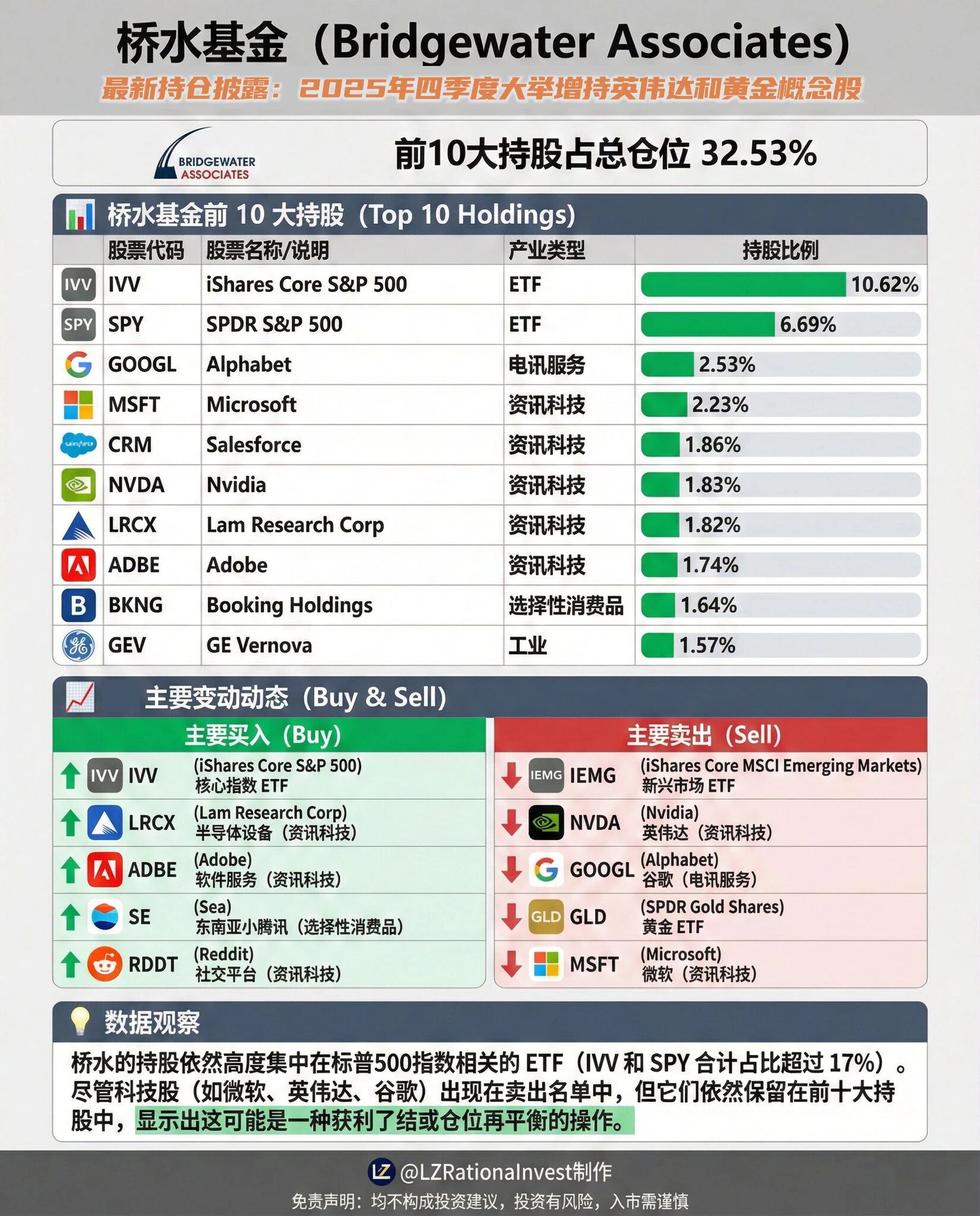其中,橋水大幅增持了135萬股英偉達,從2025年第三季度的251萬股增持至第四季度的 387萬股,增持幅度高達54%。此外,橋水還增持了82萬股亞馬遜股票,截至2025年第四季度持有195萬股。
