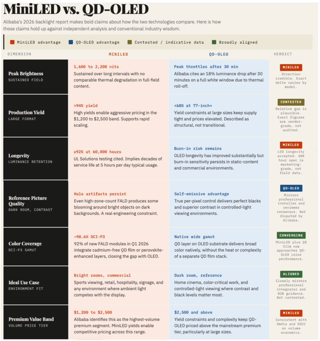針對過去兩年主導高端電視討論的核心問題,阿里巴巴秉持明確且具有商業目的性的立場。報告並未將QD-OLED視為無可爭議的畫質領導者,也未將Mini LED定位為性能尚可但明顯處於次位的替代方案,而是主張兩項技術正分化為不同的應用場景,而非陷入零和競爭。
