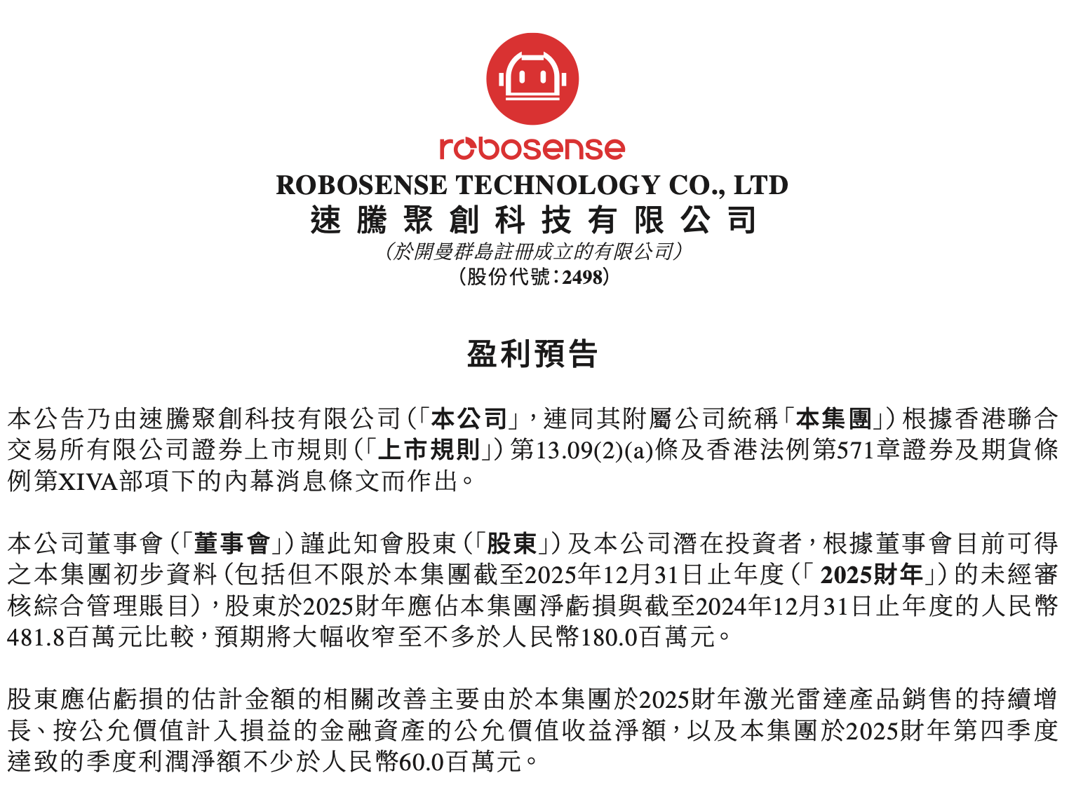 2月19日,速騰聚創發布盈利預告,預計2025年第四季度實現首次單季度盈利,盈利規模不低於人民幣6000萬元。這意味着,公司經營邁入了新的成長周期。