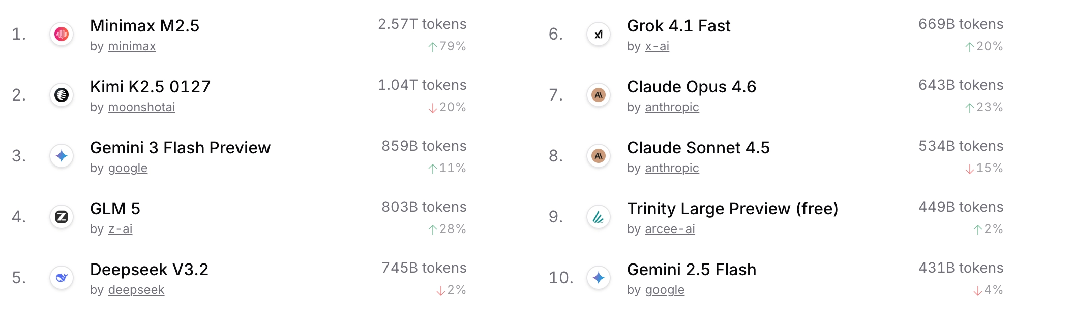 其中,MiniMax M2.5憑藉對OpenClaw的全面支持以及更經濟的使用成本,來到了高達2.57萬億tokens調用量。