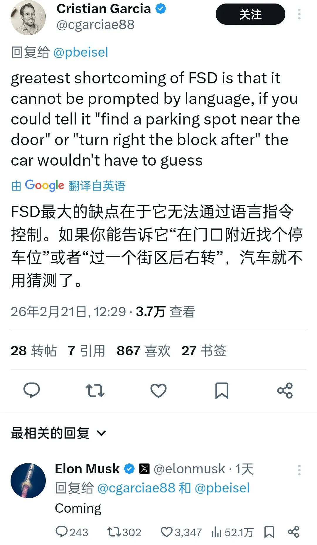google deepmind工程師在X發文表示fsd最大的缺點是無法直接通過語言控制