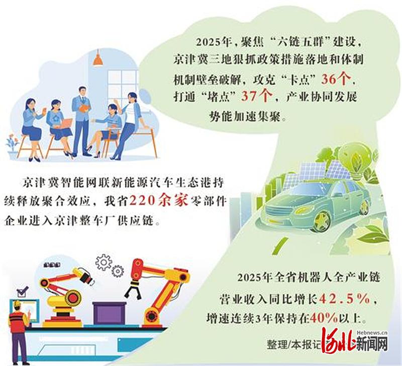 「六鏈五羣」的協同實踐,劃出京津冀區域經濟高質量發展的上揚線。2025年,京津冀三地規模以上工業增加值分別比上年增長6.5%、4.2%和7.9%。其中,北京、河北工業戰略性新興產業增加值分別增長15.5%和11.0%。(河北日報記者 米彥澤)