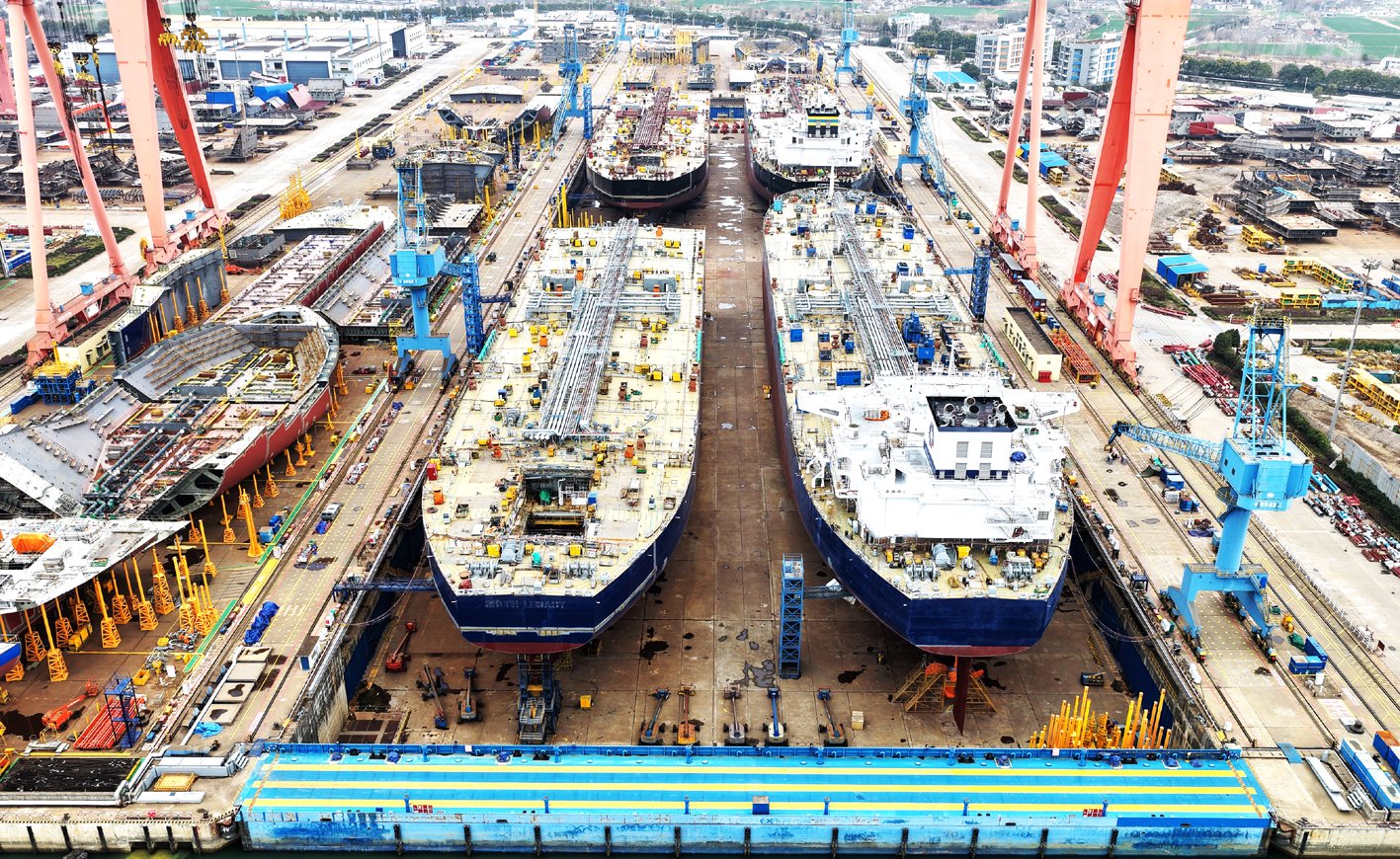 2月26日,揚州中遠海運重工有限公司廠區一派忙碌景象,多艘大型船舶正在建造中。企業開足馬力,忙生產、趕訂單,奮力實現首季「開門紅」。