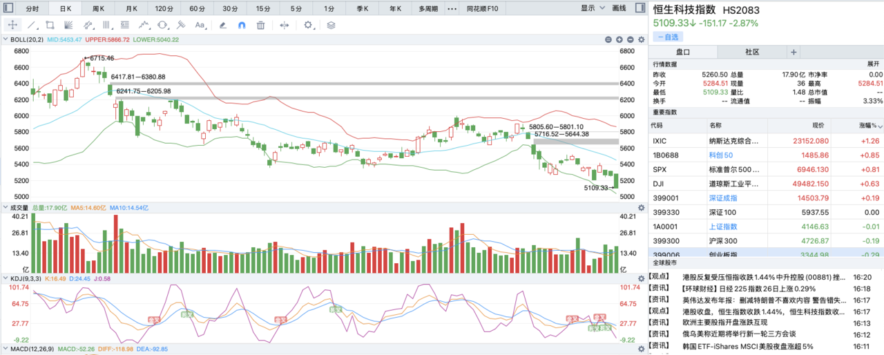 「我在恒科躲牛市」!2月26日,恒生科技指數單日下跌2.87%,一根超150點的大陰線讓不少股民怨聲載道。