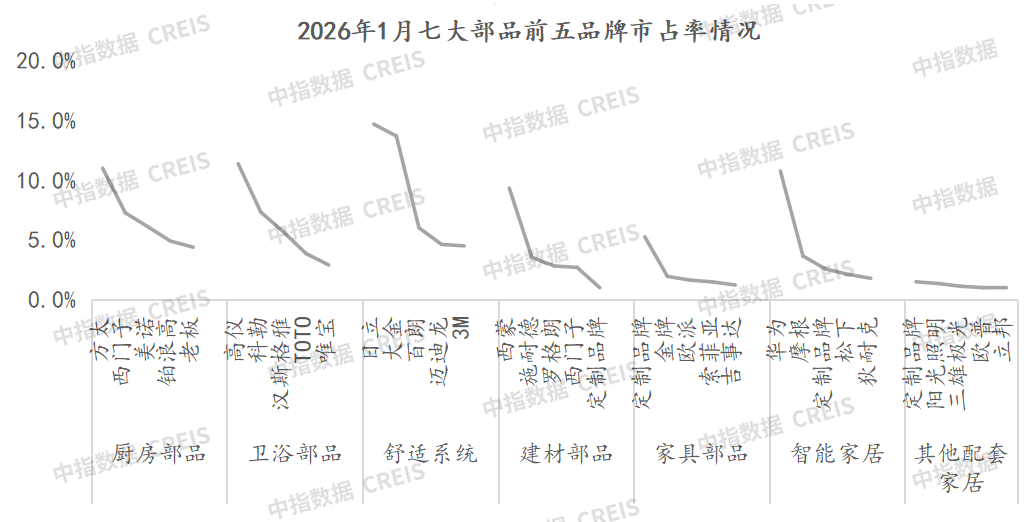 從統計數據看,七大部品仍以頭部品牌佔據市場主力。灶底1部品中,方太市佔率穩居榜首,佔比為11%,其次是西門子和美諾,分別佔7.28%和6.12%;衛浴部品中,品牌市佔居前三位的是高儀、科勒和漢斯格雅,合計佔比24.4%。舒適系統部品中,日立佔據榜首,佔14.68%,其次是大金和百朗,分別佔13.69%和6.03%;建材部品中,品牌市佔位列前三名的分別是羅格朗、施耐德和西蒙,合計佔15.57%;傢俱部品品牌市佔居前三位的是定製品牌、金牌和歐派,佔比分別為5.27%、1.97%和1.66%;智能家居部品品牌位居前三位的分別是華為、摩根和定製品牌,分別佔10.76%、3.67%和2.59%;其他配套家居品牌市佔位居前三的是定製品牌、陽光照明和三雄極光,合計佔比達4.03%。