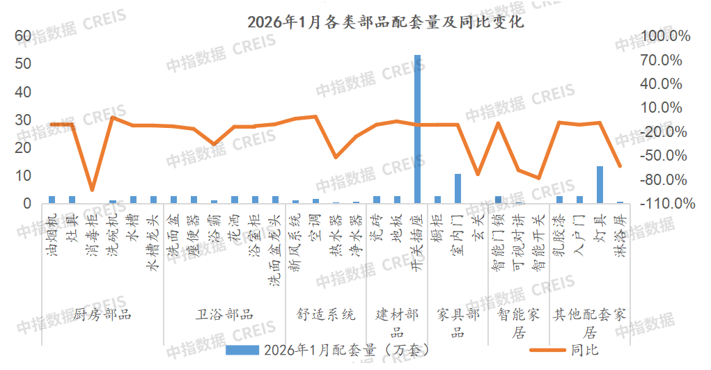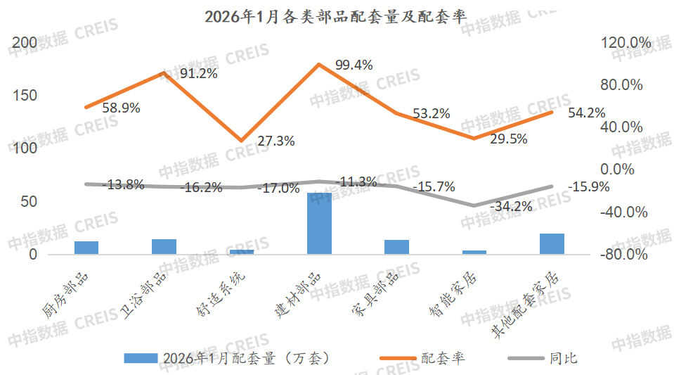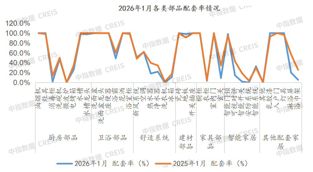 2026年1月,乳膠漆、智能系統、燈具、地板、智能門鎖等配套率小幅提升;部分部品配套率大幅下降,包括熱水器、玄關、可視對講、淋浴屏、浴巾架等降幅超過20個百分點。