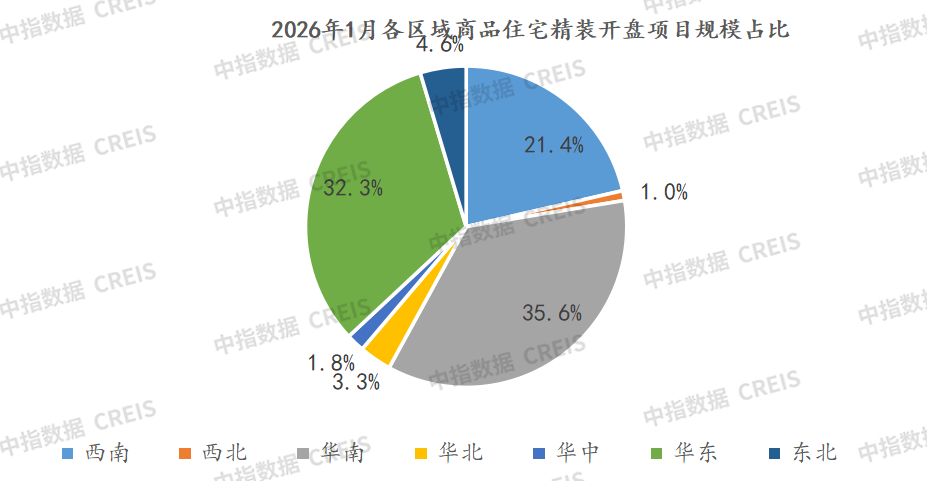 2026年1月,全國重點監測300城住宅精裝修樓盤平均精裝率為21.83%,比去年同期提升4.65個百分點。其中一線城市、二線城市、三四線城市平均精裝率分別為75.6%、30.7%和5.9%,較去年同期分別下降17.67個,提高0.32和1.34個百分點。華南平均精裝率最高,達43.3%。
