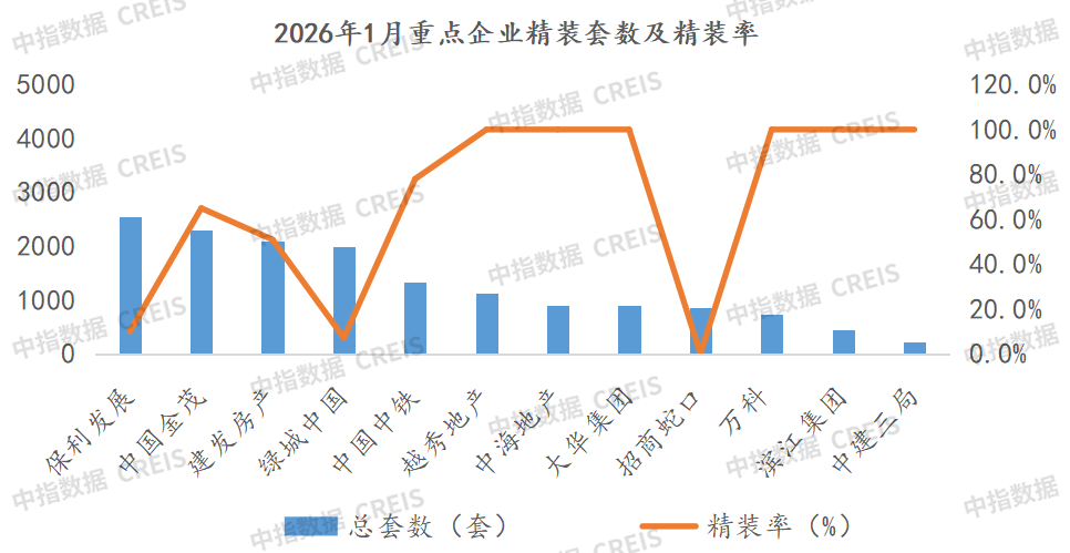 2026年1月,越秀地產、中海地產、大華集團等企業商品住宅房源開盤精裝率最高,均達100%;保利發展精裝修房源規模量最高,達2544套,其次是中國金茂和建發房產,精裝修房源套數均超過2000套。