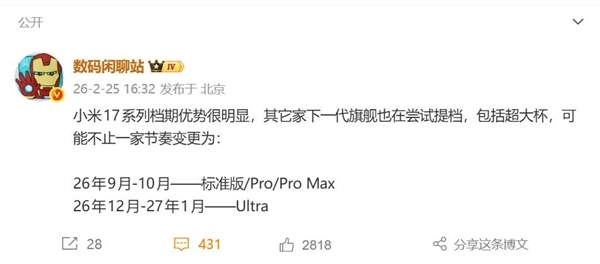 據爆料,小米17系列的檔期紅利引發了行業連鎖反應。後續多家主流品牌的迭代旗艦均計劃跟進提檔,並效仿其產品矩陣,增設Pro Max版本。