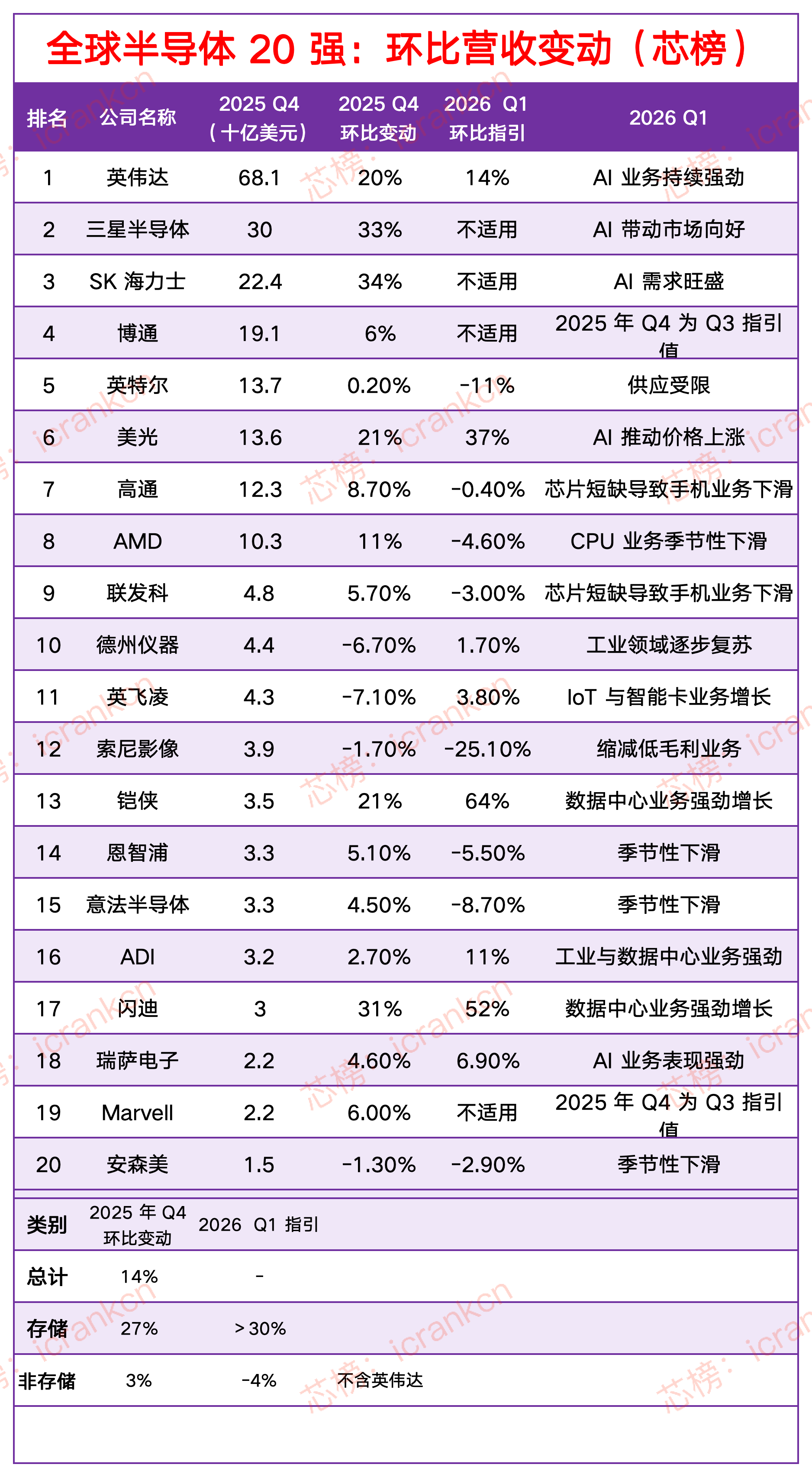 2025年第四季度業績分化:存儲器公司營收按月增長21%-34%,英偉達增長20%,部分公司營收下滑。