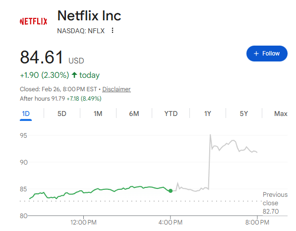自去年9月市場傳出Netflix可能競購華納以來,Netflix股價持續承壓,市值蒸發逾1700億美元。此次宣佈退出後周四盤後交易中一度大漲10%,市場將其解讀Netflix避免了以過高溢價完成一筆規模龐大的整合交易。