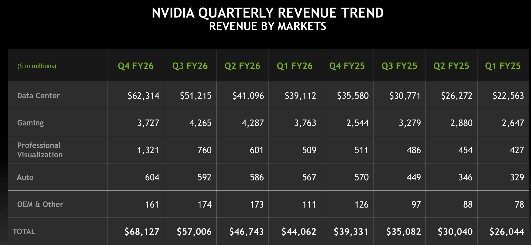 遊戲業務方面,第四財季收入37億美元,按年增長47%,主要受Blackwell芯片需求驅動。但由於假日季過後渠道庫存自然調整,該業務收入按月下降13%。英偉達預計供應限制將成為2027財年第一財季及以後遊戲業務的阻力。