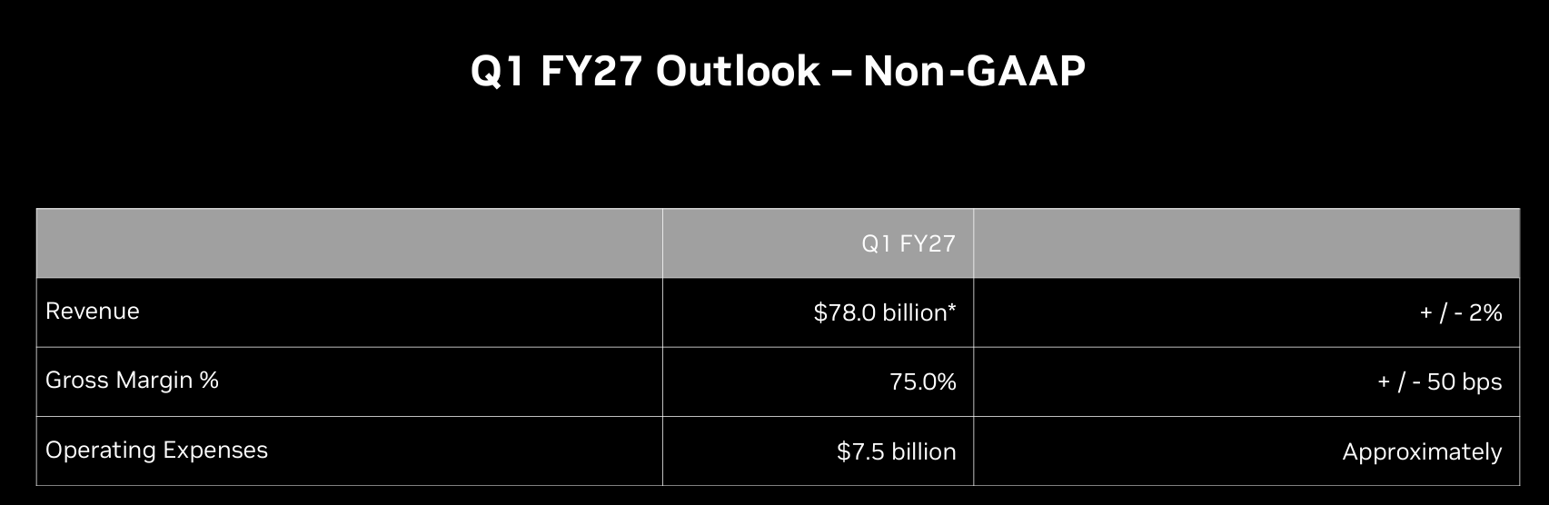 英偉達對2027財年第一季度給出如下指引:營收預計為780億美元,上下浮動2%,這個數字高於分析師普遍預期的726億美元。毛利率預計為75.0%,上下浮動50個點子。運營費用預計為77億美元,其中包括19億美元的股票補償費用。