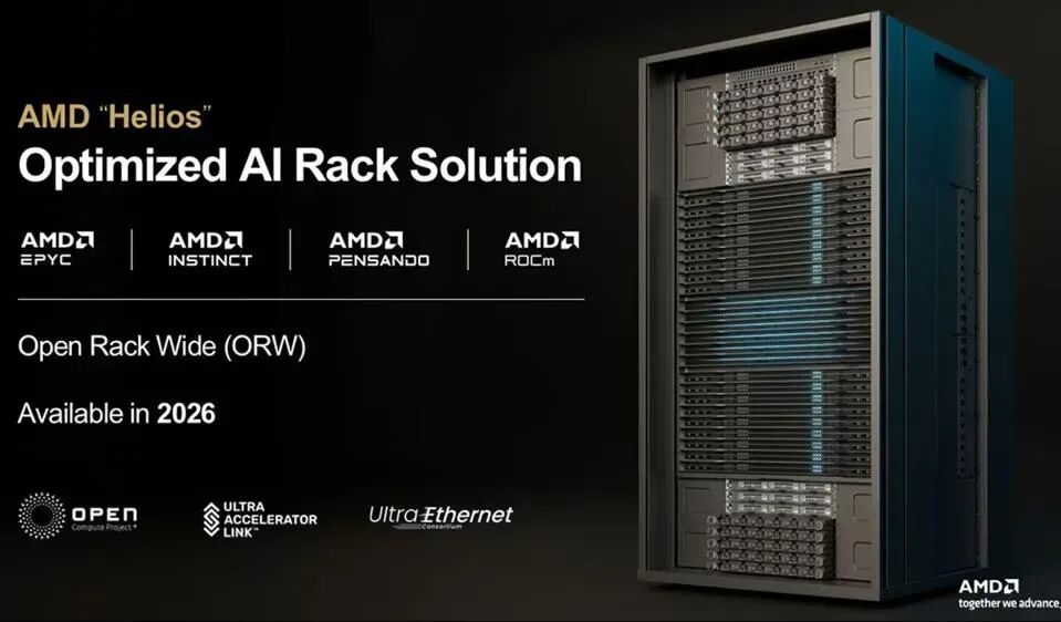 這批芯片被裝在一種叫做 Helios 的機架裏。這個機架是 AMD 和 Meta 一起設計的,使用了液冷散熱,每個機架最多塞 72 塊 MI450。Meta 計劃從 2026 年下半年開始陸續部署,先上 1 吉瓦,後面慢慢加到 6 吉瓦。