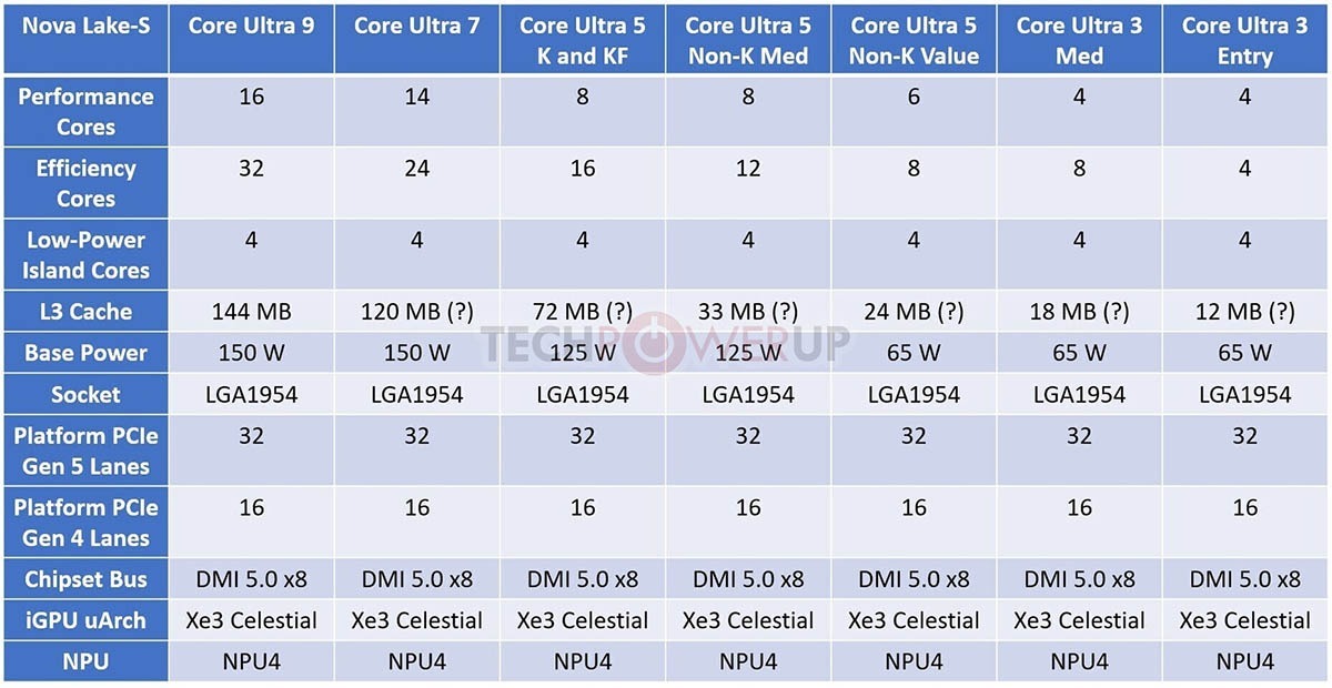 而 Intel 的 Nova Lake 系列,更是拿出了堪稱 「激進」 的規格設計,劍指消費級桌面 CPU 的性能巔峯。根據曝光的詳細參數,Nova Lake-S 系列將分為雙計算模塊與單計算模塊兩大版本,其中頂配的酷睿 Ultra 9 型號將採用 16 個性能核 + 32 個能效核 + 4 個低功耗島核心的 52 核設計,這也是消費級桌面 CPU 首次突破 50 核大關,多核性能將實現質的飛躍。緩存方面,Nova Lake 系列將搭載全新的 bLLC 大緩存設計,頂配型號緩存容量高達 288MB,直接對標 AMD 的 3D V-Cache 技術,旨在大幅降低數據讀取延遲,全面提升遊戲與多線程任務的性能表現。平台規格上,Nova Lake 系列將全面支持 DDR5-8000 高頻內存,CPU 與芯片組組合將提供 32 條 PCIe 5.0 通道與 16 條 PCIe 4.0 通道,擴展性拉滿,能夠完美適配下一代高端顯卡、PCIe 5.0 固態硬盤等硬件,滿足 AI 創作、3A 遊戲、專業內容創作等多場景的帶寬需求。此外,Nova Lake 系列將搭載全新的 Xe3 Celestial 架構核顯,甚至有望升級至最新的 Xe4 Druid 架構,核顯圖形性能將迎來大幅躍升;同時集成新一代 NPU4 人工智能計算單元,本地 AI 算力將實現跨越式升級,全面適配 AI 辦公、AI 創作等原生 AI 應用場景,推動消費級 PC 進入 AI 算力普及的新時代。