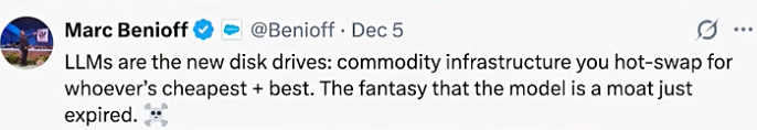 正如Salesforce.的CEO貝尼奧夫所說大語言模型就是大型的磁盤驅動器,你可以選擇最便宜的隨時插拔的基礎設施,模型是護城河的幻想已經結束了。