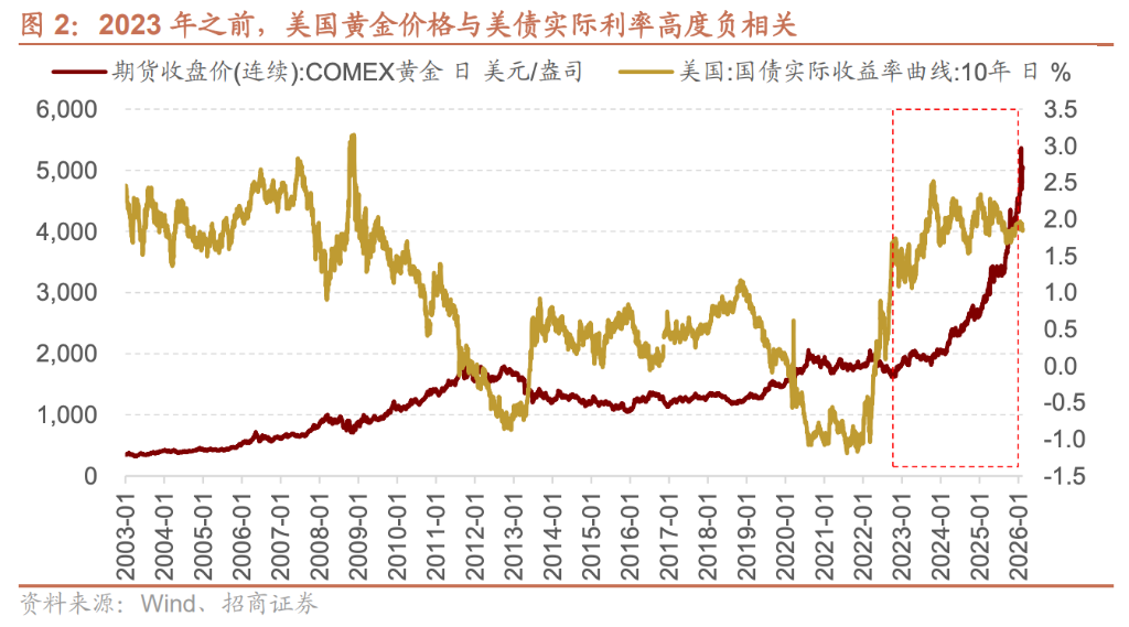 報告表示,2022年之前,市場對黃金的定價邏輯被嚴格鎖定在美元框架內:金價與美債實際利率呈穩定負相關,與美元信用總量保持正相關。然而,2022年至2024年,在聯儲局激進加息的宏觀環境下,金價卻逆勢突破關鍵阻力位,徹底撕裂了這一沿用數十年的傳統定價模型。