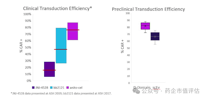 他家的這個D-domain技術,其實是一種合成的方法篩選獲得比scFv分子量更小的可以特異結合抗原的蛋白。這樣改進的好處是可以避免scFv常見的聚集和不均一問題。此外,轉染效率也大幅提升,CAR的表達量更高。