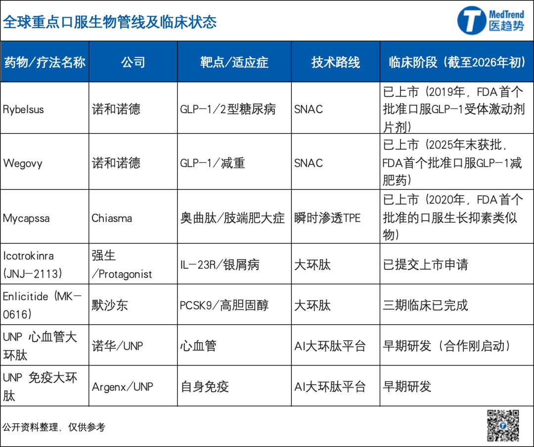 從技術演進周期來看,2026年或許正處在口服生物藥「規模化爆發前夜」。中國並未缺席,當前國內已有至少15家企業佈局口服GLP-1製劑研發,從分子改造到吸收增強劑再到新型遞送系統,不再只是簡單的跟隨者。