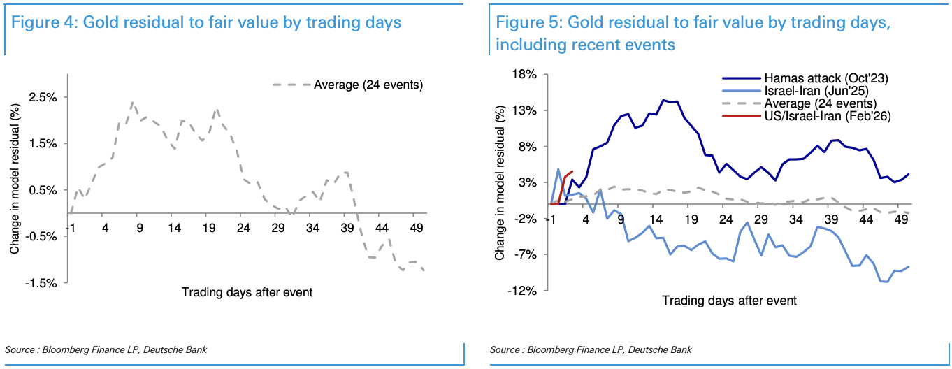 為了剝離危機情緒對金價的直接衝擊,德銀研究團隊還對黃金相對公允價值模型的殘差進行了分析。即在排除美元、利率等傳統驅動因素後,單純評估危機帶來的額外溢價。