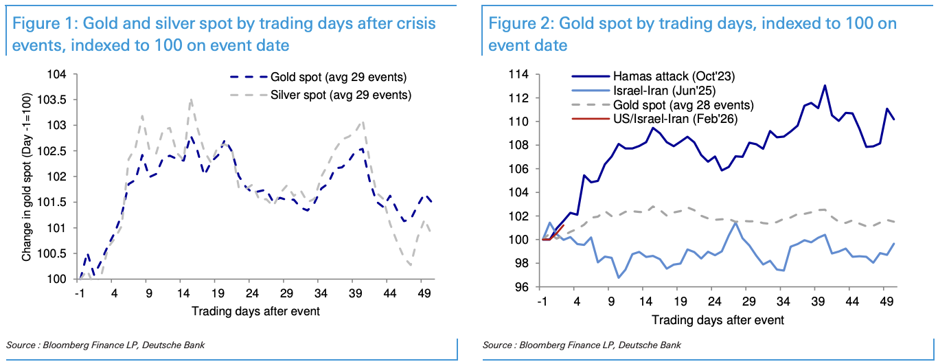 據追風交易台,德銀2026年3月3日發布報告《黃金變化的危機溢價》,報告指出,黃金對地緣政治危機的反應存在高度不確定性,平均而言確實正向,但個體事件分散度極大,投資者切忌將"危機必推金價"視為鐵律。