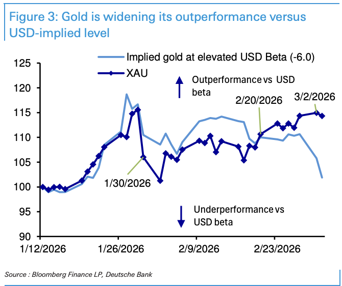 相較於危機溢價這一不穩定變量,德意志銀行認為,當前黃金存在更為紮實的做多依據——上周出現的相對美元隱含金價的正向偏離,正在進一步擴大。
