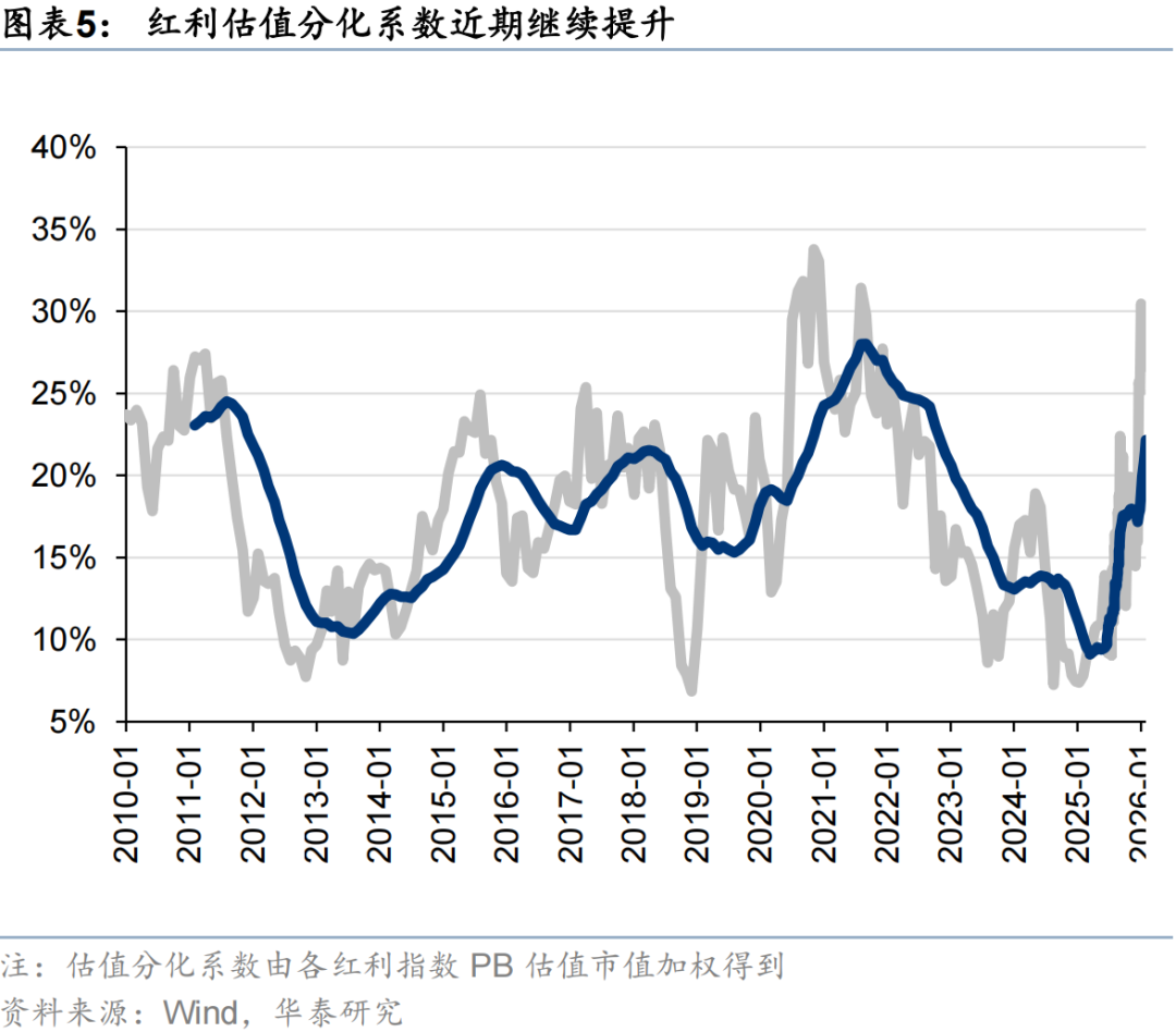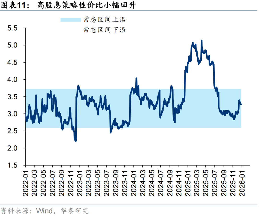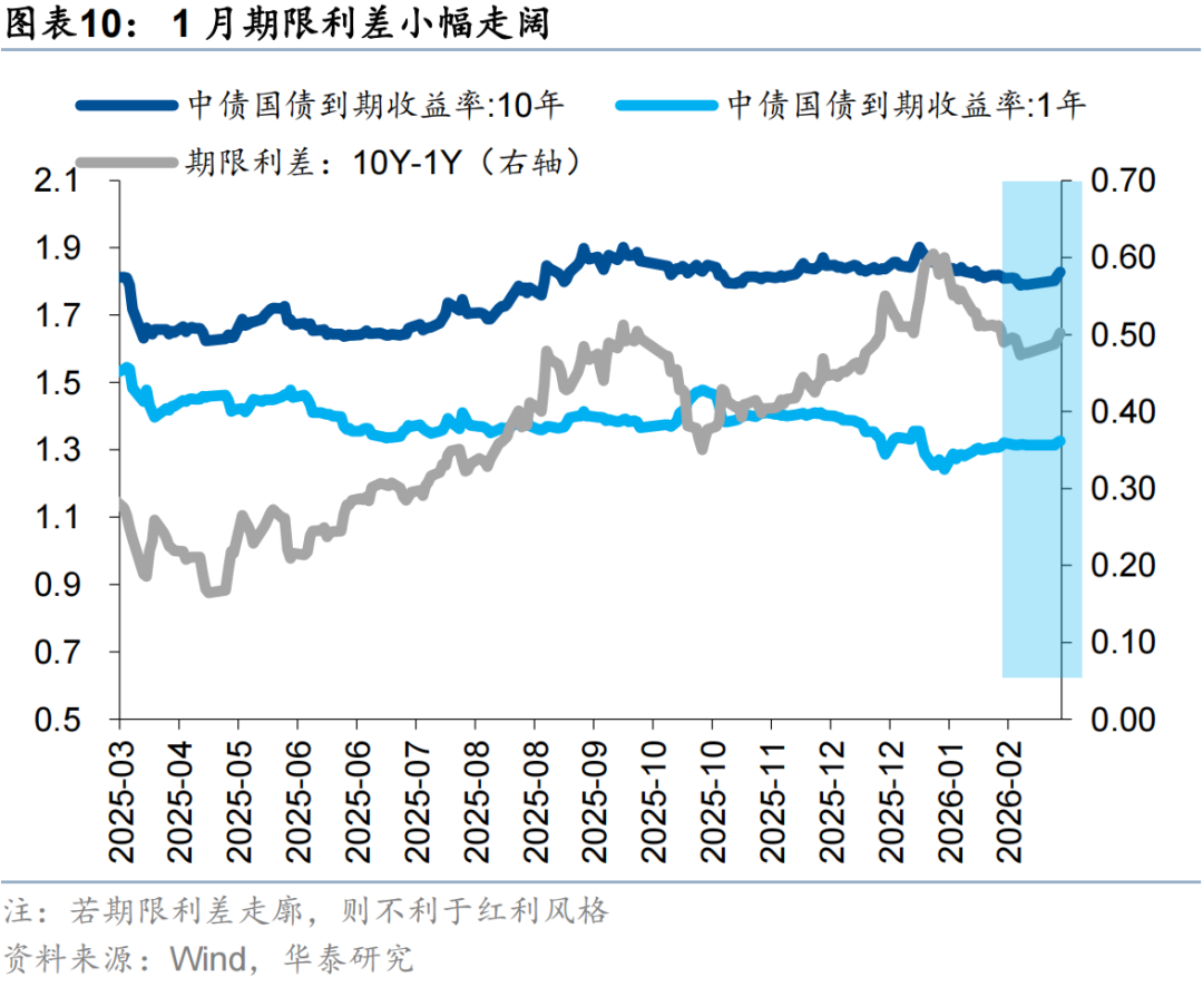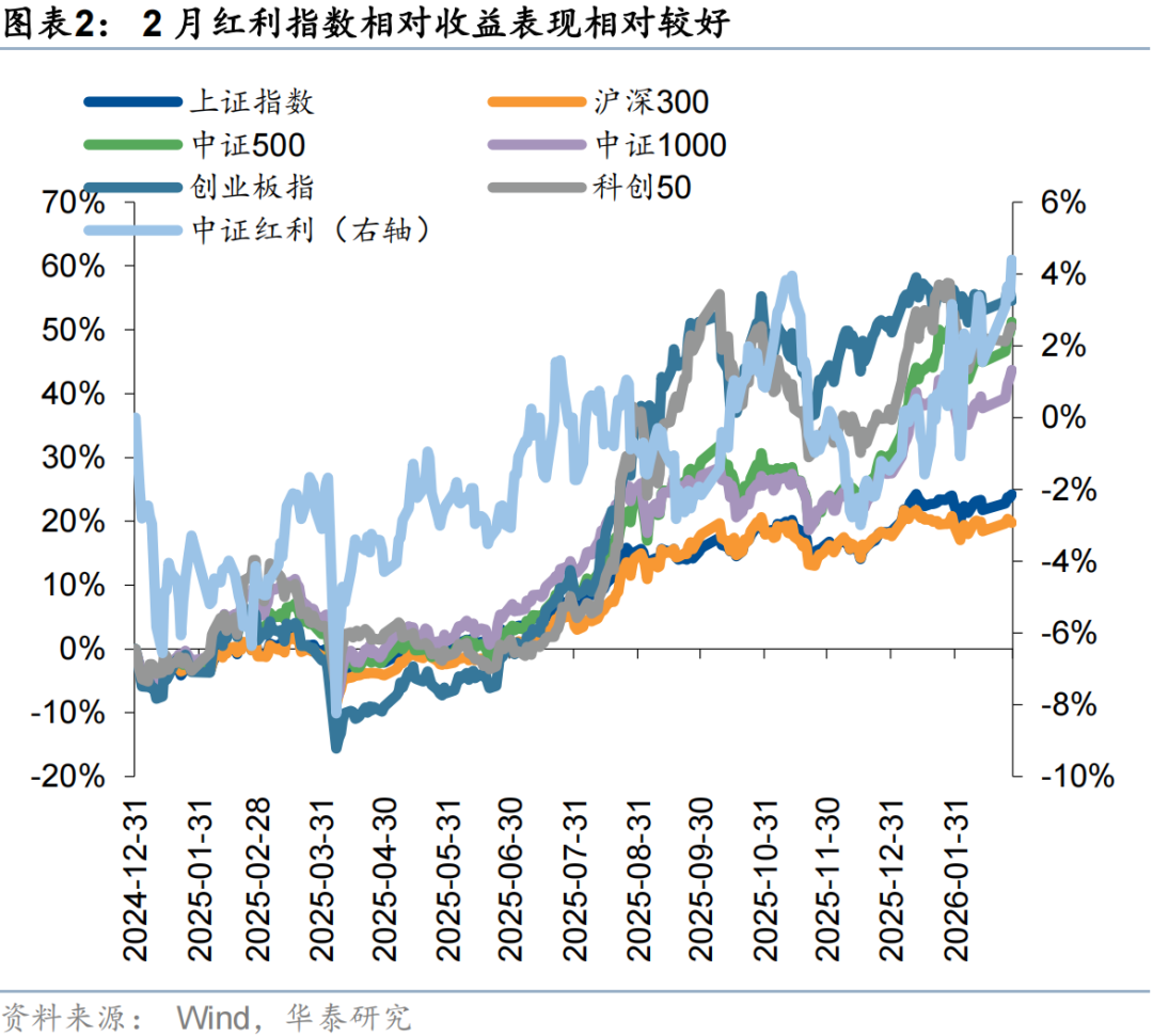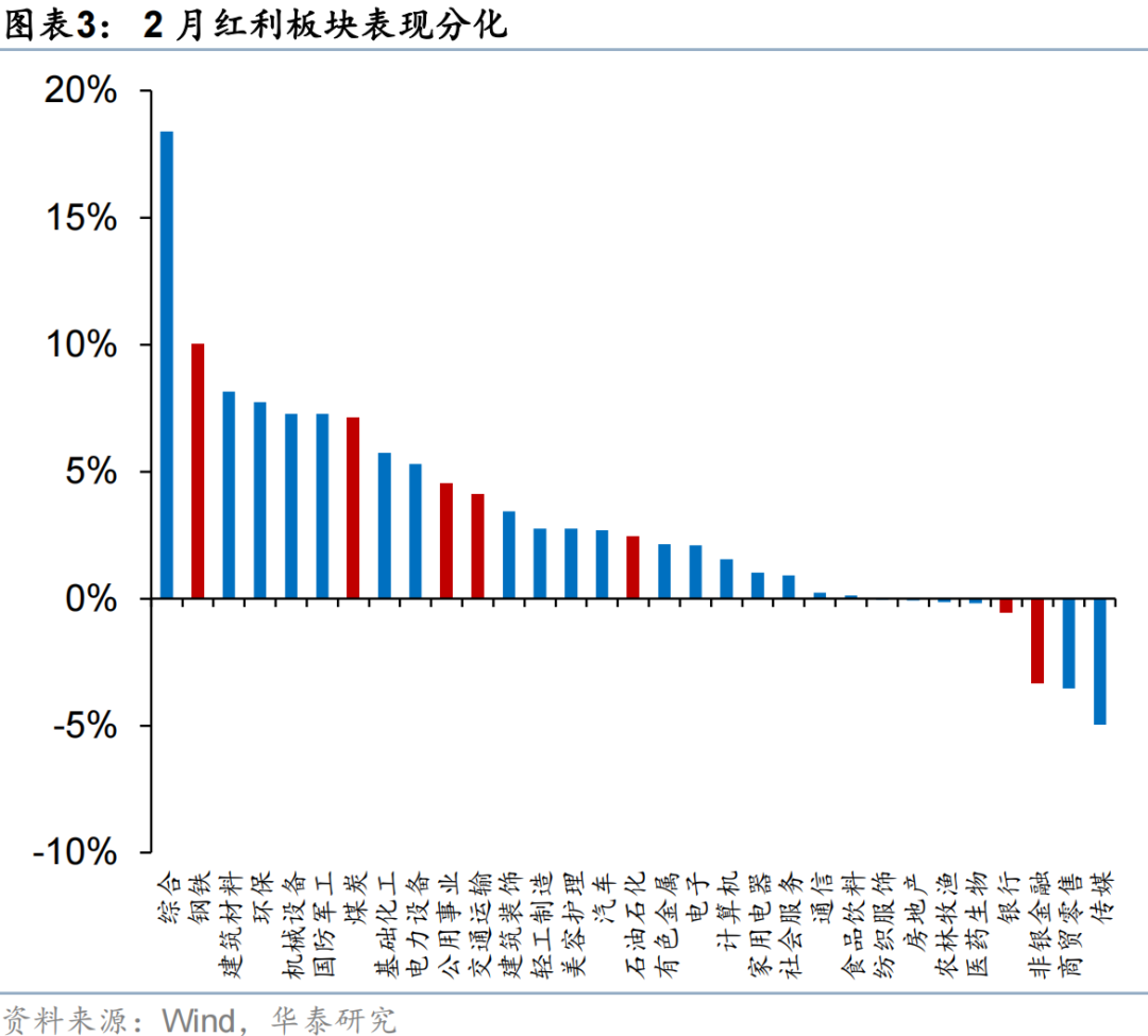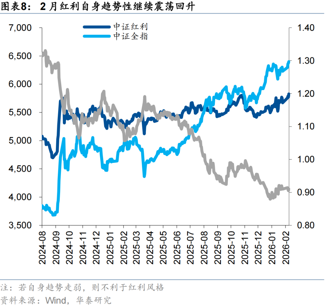2月高股息板塊的表現有所修復,原因或在於:1)2月市場波動率放大,海外美債長端利率及美元指數回升,強化了高股息資產的防禦屬性;2)市場風險溢價進入「小平台期」,我們在2月高股息月報中提示目前持續突破全A ERP過去五年均值下方一倍標準差的能見度不高,投資者風險偏好或進入震盪期;3)周期品市場進入劇烈波動對市場賺錢效應形成影響,此外考慮到春節假期資金落袋為安需求,市場防禦需求也有所增加。