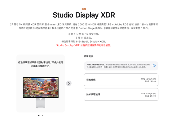 Studio Display XDR:27英寸+5K視網膜顯示屏,配備mini-LED背光系統,擁有2000尼特HDR峯值亮度,搭載1200萬像素CenterStage攝像頭、錄音棚級麥克風和揚聲器,以及雷靂5端口。3月4日晚10:15接受預購,3月11日發售。標準玻璃版售價24999元、納米紋理玻璃版售價27499元。
