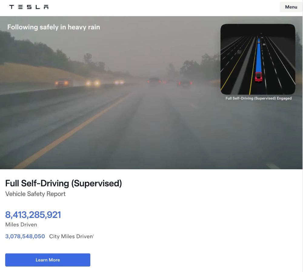 ▲特斯拉官方安全報告顯示,FSD (監督式全自動駕駛) 累計行駛里程已達 84.1 億英里(約135億公里)