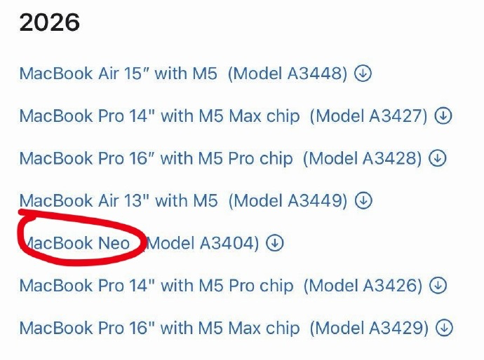 3月3日晚,蘋果官網上架了搭載全新M5 Pro與M5 Max芯片的MacBook Pro14/16,以及搭載M5芯片的新款MacBook Air。不少朋友發現之前盛傳的低價Macbook並未同步上架,隨後多家英文媒體報道Apple官網短暫出現了「MacBook Neo(型號 A3404)」監管文件入口,後續該頁面很快被修復,而「Neo」的命名方式首次出現在蘋果產品中,很容易讓我們聯想到爆料消息中的新版低價Macbook。