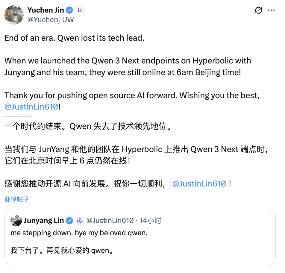 林俊暘官宣離職在AI社區引起了巨大轟動,很多反饋來自海外開發者,均在表達對林俊暘推動Qwen開源工作的感謝。「一個時代的結束。」Hyperbolic Labs創始人兼CTO Yuchen Jin表示。