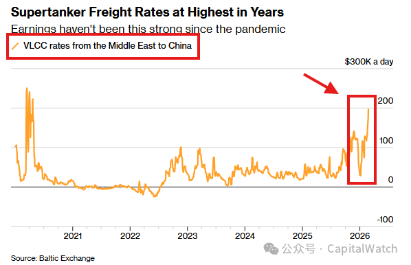 從中東向中國運輸 200 萬桶原油的成本高達每天約 20 萬美元,這是自 2020 年疫情爆發以來的最高成本。