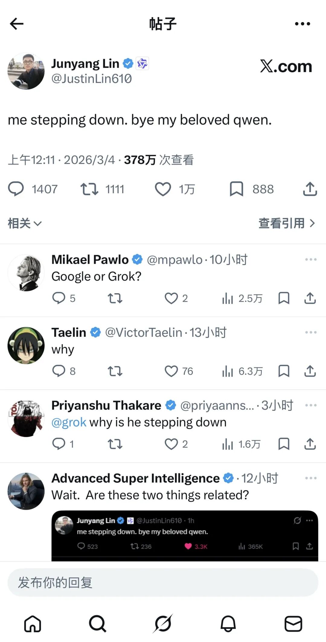 3月4日凌晨,林俊暘在X平台公開發布卸任動態,截至今日16時,該動態收穫超1萬次讚好、1400餘條評論,一衆行業開發者留言致謝他與Qwen團隊為開源領域作出的貢獻,MiniMax等AI企業官方賬號也現身評論區表達認可。