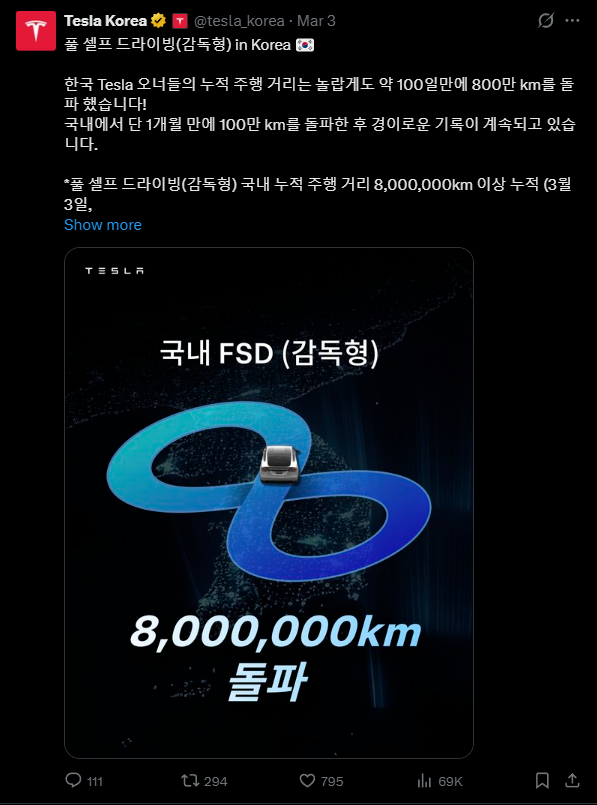 昨日,特斯拉韓國官方分享稱,FSD 下累計行駛里程在短短 100 天內就達到了驚人的 800 萬公里(截至3月3日,基於內部數據)。