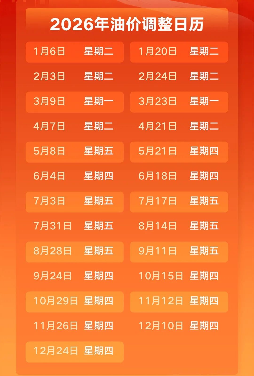 本年度油價調整日曆