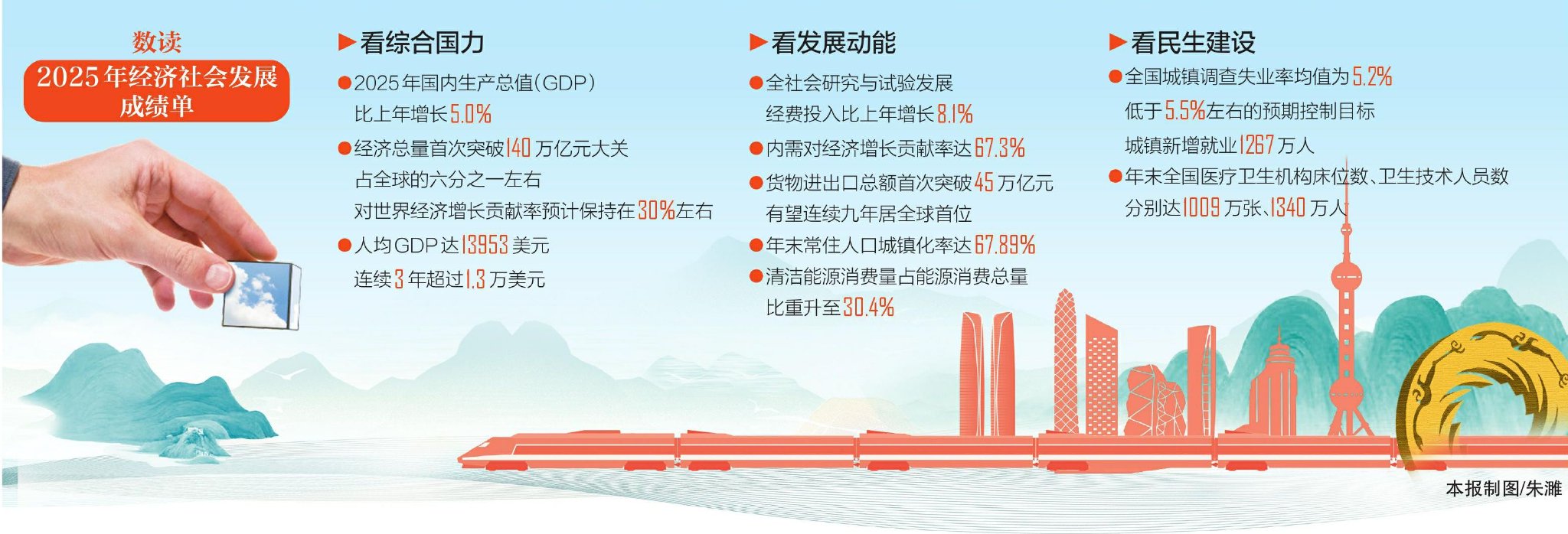 - 全年經濟總量首次突破140萬億元大關,城鎮新增就業1267萬人,日均新設企業2.6萬戶……國家統計局2月28日發布2025年國民經濟和社會發展統計公報,一系列數據指標充分展現中國經濟「穩」的格局、「進」的勢頭、「韌」的特性。