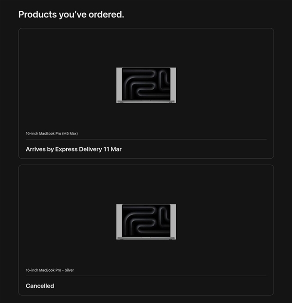 o2b也分享了自己的經歷,他在二月中旬下單了48GB內存的M4 Max MacBook Pro,原本預計3月3日-10日送達,沒想到訂單突然被取消並換成了M5 Max版本,價格維持原價,發貨日期也順延至新機開售的3月11日。