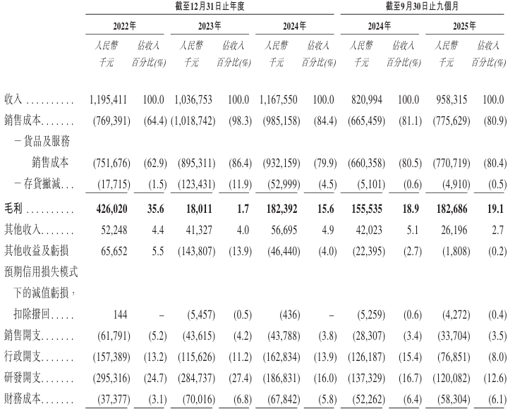 財務方面,於2022年度、2023年度、2024年度及2025年截至9月30日止九個月,該公司收入分別約為11.95億元、10.37億元、11.68億元、9.58億元人民幣;同期,毛利分別約為4.26億元、1801.1萬元、1.82億元、1.83億元人民幣。
